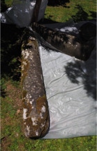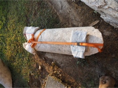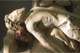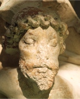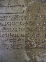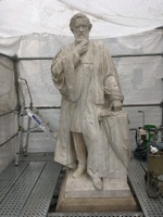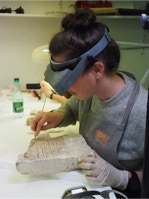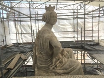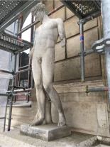 Dé-restauration : démontage de fragments anciennement maintenus au plâtre et au ciment, retrait de fragments n’appartenant pas à l’œuvre.